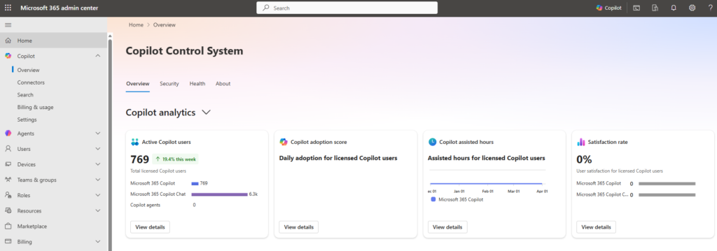 C’est le centre de contrôle de l’expérience Copilot elle-même. Quand vous cliquez sur « Copilot > Overview », vous arrivez sur la page Copilot Control System, un dashboard avec quatre onglets : Overview, Security, Health et About.
