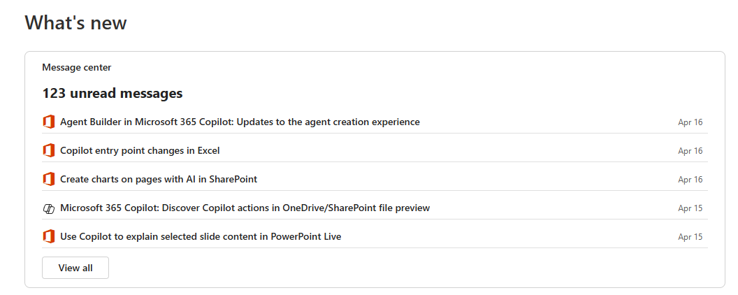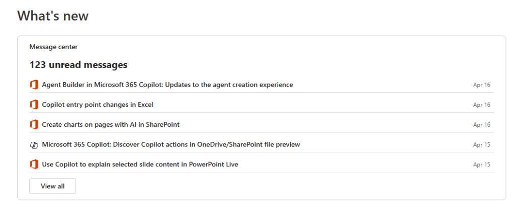 - Overview : Le tableau de bord principal. Il affiche des recommandations, des indicateurs de santé, et des raccourcis vers les actions les plus courantes ou les nouveautés à venir concernant Copilot (What’s new).