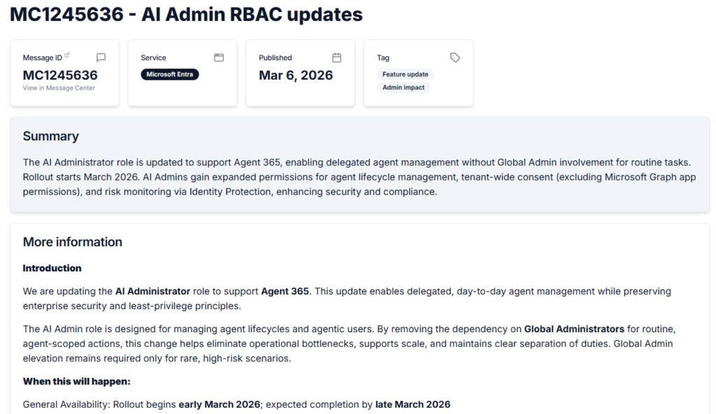 Le rôle AI Administrator a été introduit par Microsoft en novembre 2024. À l’époque, c’était un rôle assez limité qui permettait principalement de gérer les paramètres Copilot de base. En mars 2026, avec l’arrivée d’Agent 365, Microsoft a considérablement élargi les permissions de ce rôle (notification MC1245636).
