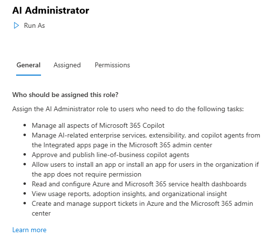 - AI Administrator role : https://learn.microsoft.com/en-us/entra/identity/role-based-access-control/permissions-reference#ai-administrator