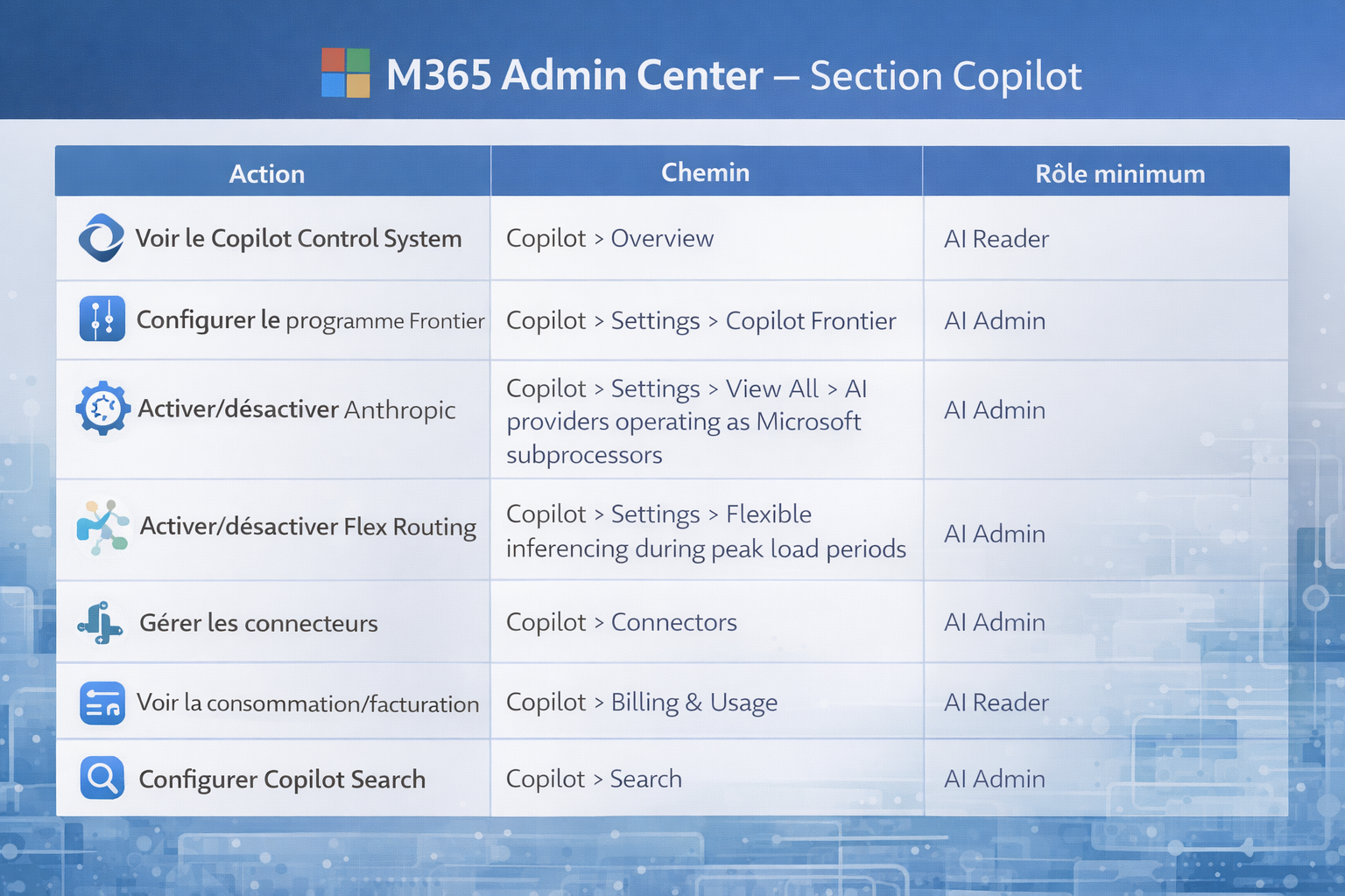 Cet article est le premier vrai article « Prise en main » de cette série. On va explorer ensemble le portail d’administration Microsoft 365 Admin Center et ses deux sections dédiées à Copilot et aux agents, configurer les paramètres critiques (Frontier, Anthropic, Flex Routing), comprendre le rôle AI Administrator et ses limites, et assigner les licences Copilot à vos utilisateurs. C’est le guide que j’aurais aimé avoir quand j’ai commencé à administrer Copilot sur mon propre tenant.