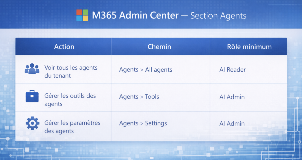 Comme évoqué dans la conclusion de l’article 1, le portail M365 Admin Center n’est qu’une pièce du puzzle. Voici un rappel des autres consoles que vous utiliserez au quotidien pour gérer vos agents et Copilot, avec les rôles nécessaires :