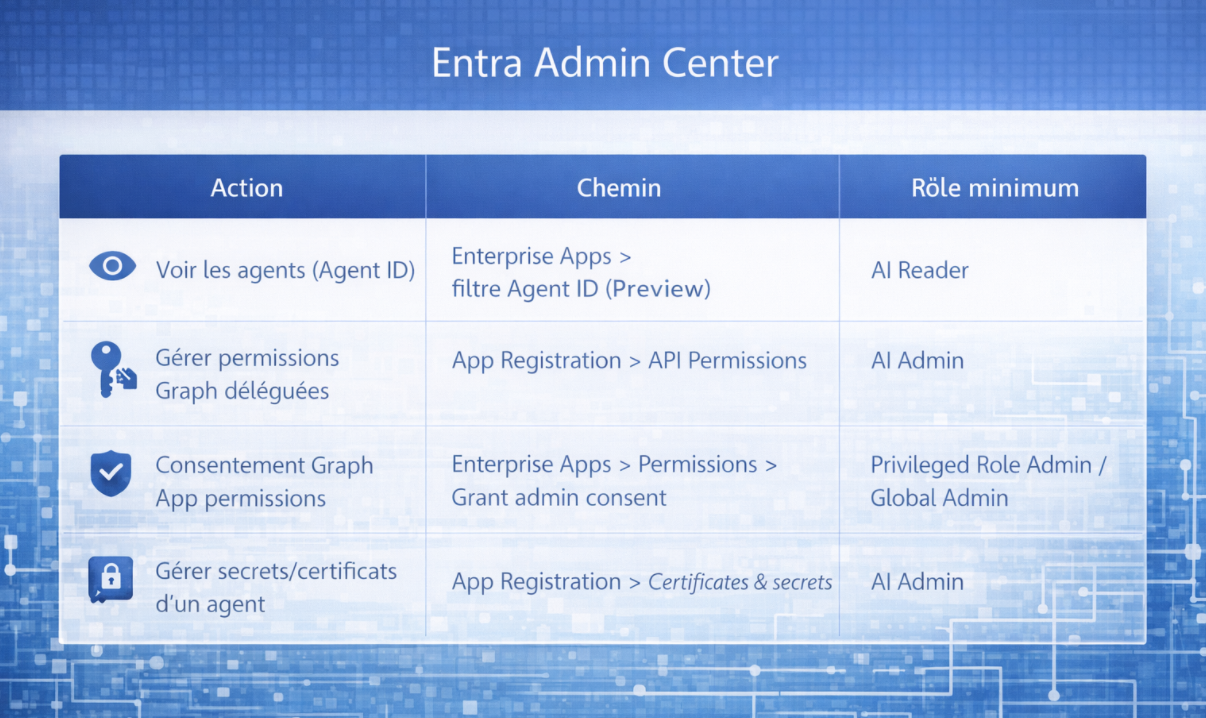 L’administration est possible depuis : le portail M365 Admin Center, le portail Entra ID, PowerShell et les API Microsoft Graph.