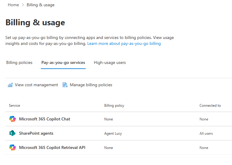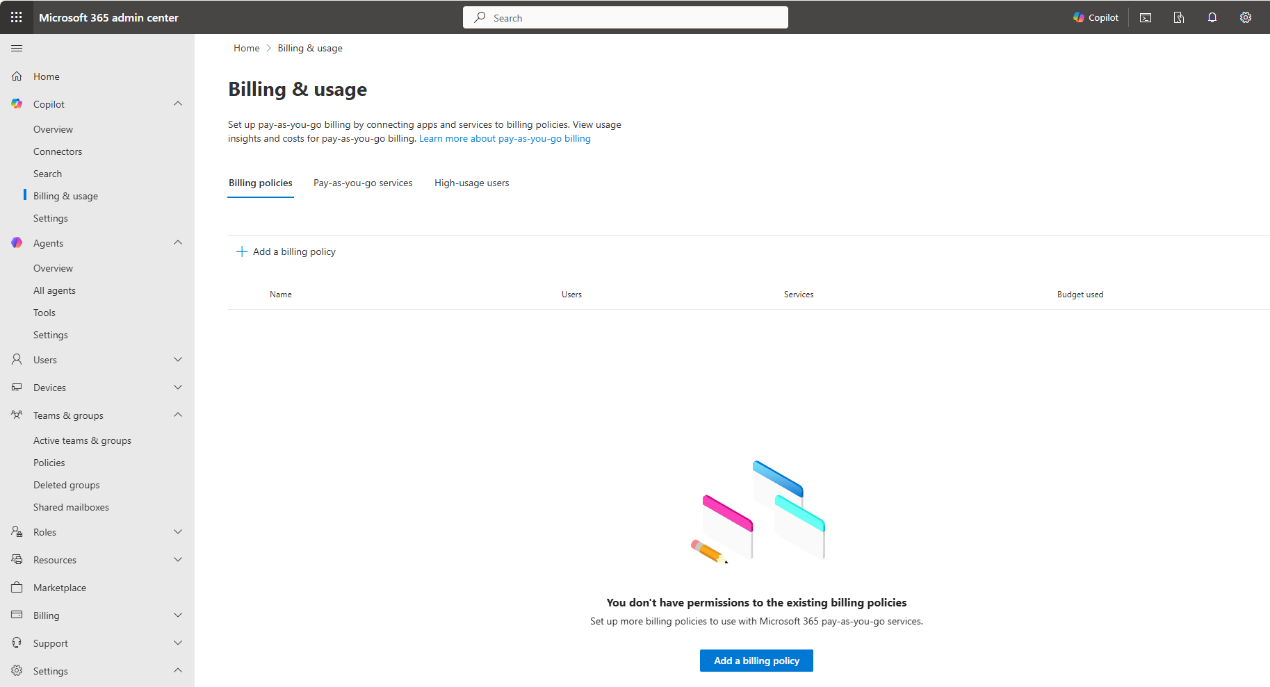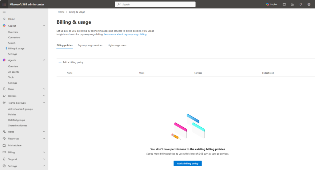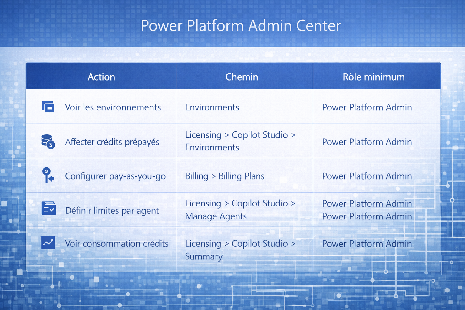 C’est ici que vous gérez les environnements Power Platform (où vivent les agents Copilot Studio), les crédits Copilot Studio (affectation, monitoring, limites par agent) et les billing plans pay-as-you-go.