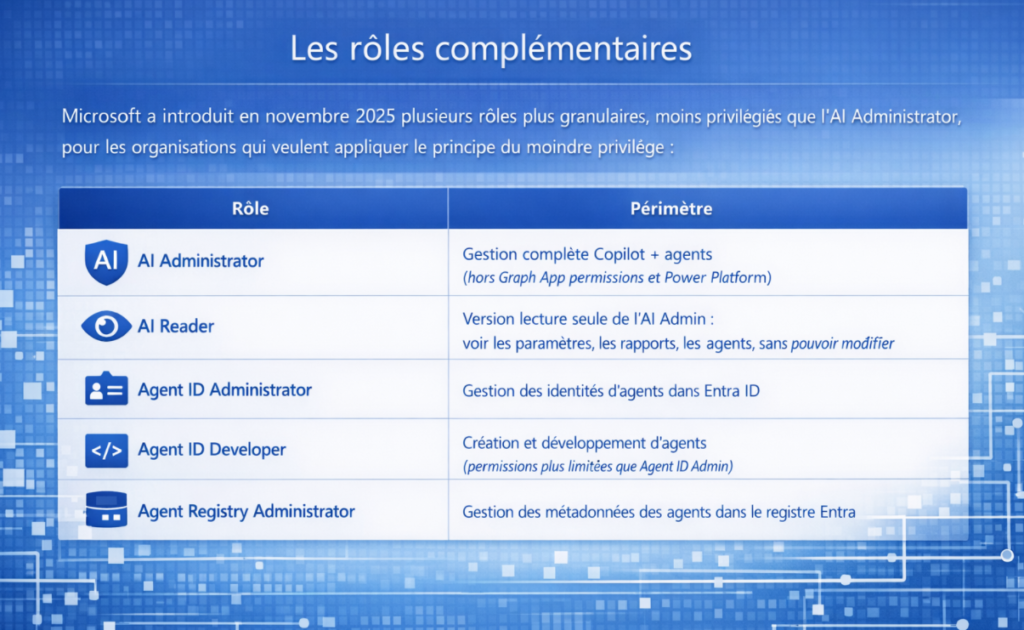Microsoft a introduit en novembre 2025 plusieurs rôles plus granulaires, moins privilégiés que l’AI Administrator, pour les organisations qui veulent appliquer le principe du moindre privilège :