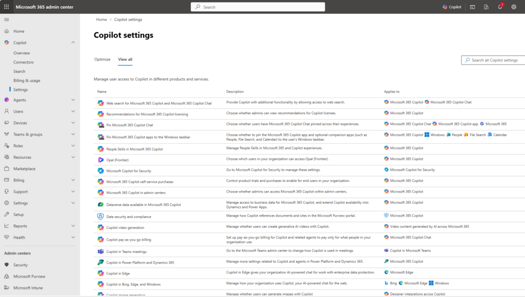 - Settings : C’est ici que se trouvent les paramètres les plus critiques de votre tenant pour Copilot. On va les détailler un par un dans la suite de cet article.