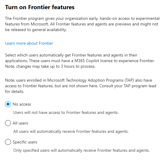 - No access : Aucun utilisateur n’a accès aux fonctionnalités Frontier. C’est l’option par défaut pour les tenants EU/EFTA.