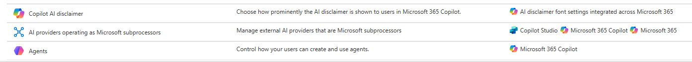 NB : Ce paramètre couvre Microsoft 365 Copilot et Copilot Chat. Il existe un paramètre séparé dans le Power Platform Admin Center pour Copilot dans Dynamics 365, Power Platform et Copilot Studio. Le paramètre du portail Power Plateform Admin Center (PPAC) respecte celui du portail M365 Admin Center sauf s’il est configuré de manière plus restrictive.