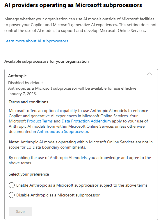 C’est ici que vous contrôlez l’activation des modèles Claude d’Anthropic dans votre tenant. Comme nous l’avons vu dans l’article 1, Anthropic est un sous-traitant de Microsoft dont les modèles sont exclus de l’EU Data Boundary (Le traitement de vos Prompts, sera transféré sur les serveurs d’Anthropic aux USA pour être traités et le résultat vous serez retourné ensuite. Bien que les données transférées aux USA soit partiellement anonymisées pour masquer des numéros de compte, login/password ou autres informations confidentielles, c’est un élément à prendre en considération dans votre réflexion).