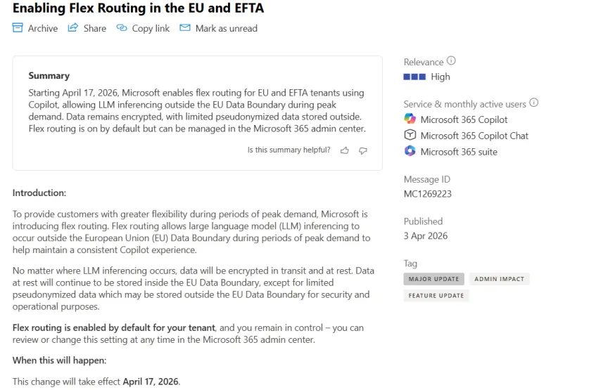 - Tenants existants avant le 25 mars 2026 : vérifiez votre notification Message Center (MC1269223) pour connaître le défaut de votre tenant. Certains tenants EU rapportent que le Flex Routing est off par défaut et doit être activé manuellement, tandis que d’autres rapportent l’inverse.