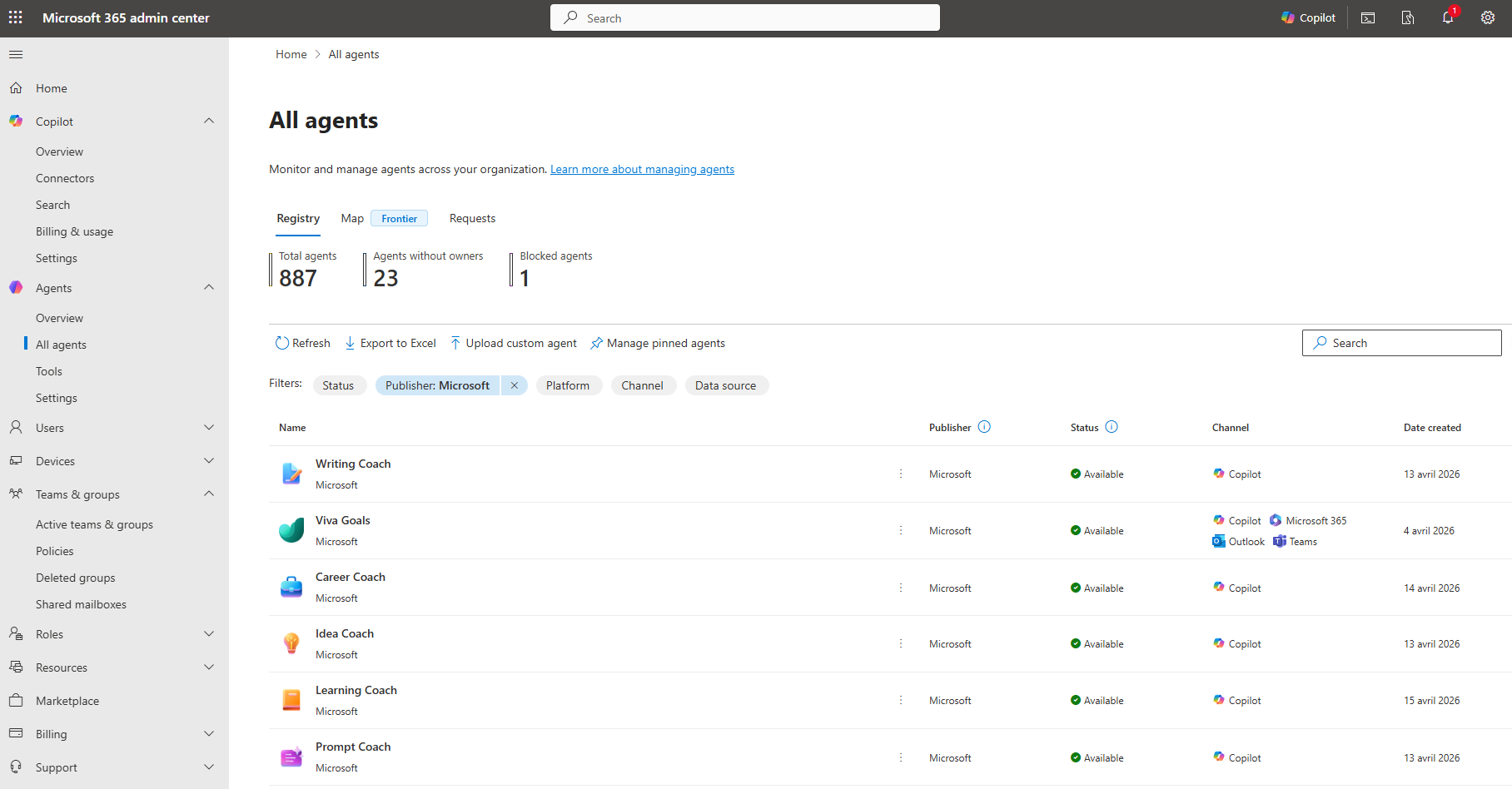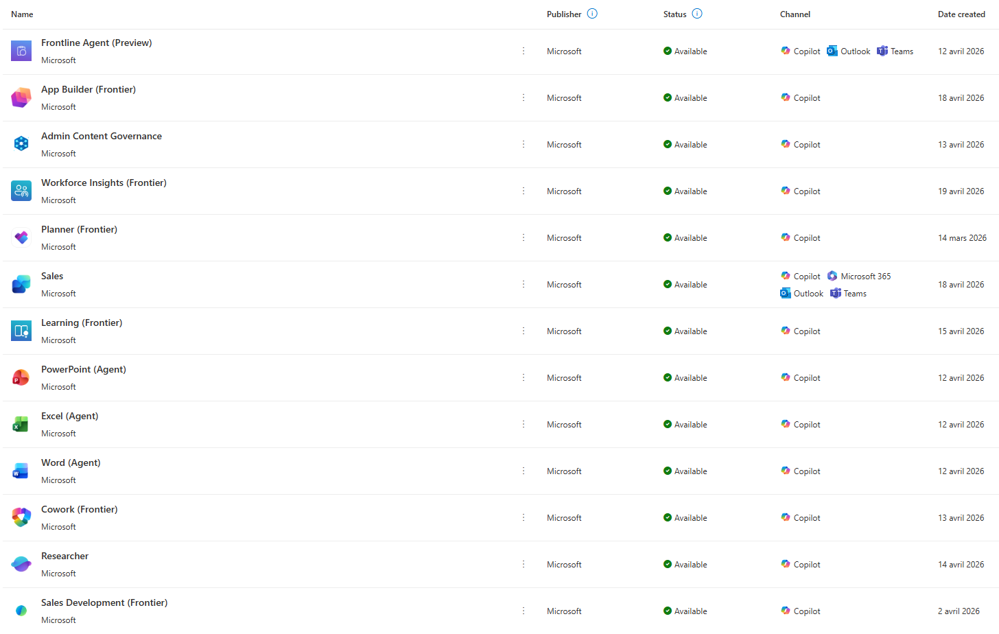 - All agents : L’inventaire complet de tous les agents visibles dans le tenant. C’est ici que converge Agent 365 (à partir du 1er mai 2026). Vous y retrouverez les agents créés via Agent Builder, les agents Frontier (comme Cowork), et à terme les agents Copilot Studio.