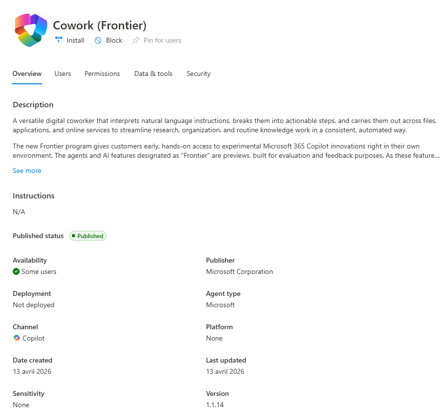 - Vous pouvez déployer Cowork au nom des utilisateurs (ils n’auront pas besoin de l’installer eux-mêmes depuis l’Agent Store).