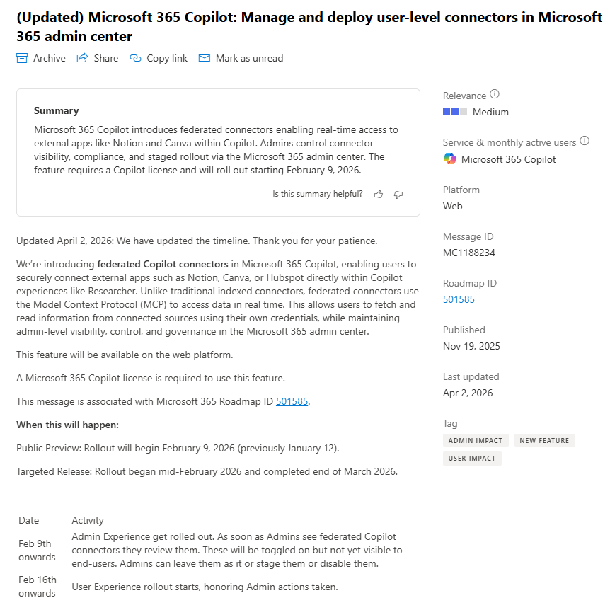 La notification MC1188234 annonce une nouveauté importante : la possibilité de gérer et déployer des connecteurs au niveau utilisateur directement depuis le M365 Admin Center. Jusqu’à présent, les connecteurs étaient exclusivement des objets tenant-wide. Cette évolution permet un déploiement plus granulaire.