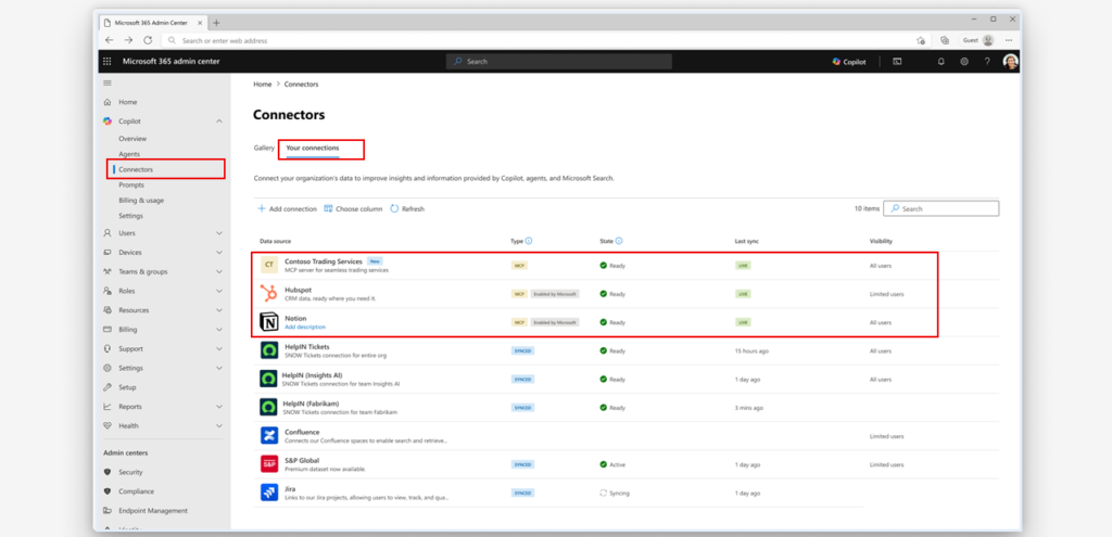 - Connectors : La gestion des connecteurs Copilot (synchronisés et fédérés). C’est ici que vous déployez des connecteurs depuis la galerie, vérifiez l’état des connexions et gérez l’ingestion de données externes dans Microsoft Graph. Nous y reviendrons en détail dans les articles 6 et 7.
