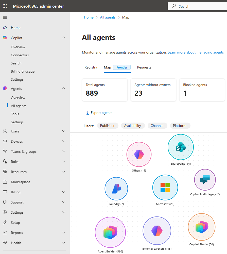 Agents > All agents > Map (Frontier) est un dashboard représentant une cartographie graphique de l’ensemble de vos agents. Une vue qui vous permet de suite de voir le nombre et le type d’agent que vous possédez dans votre Tenant M365.