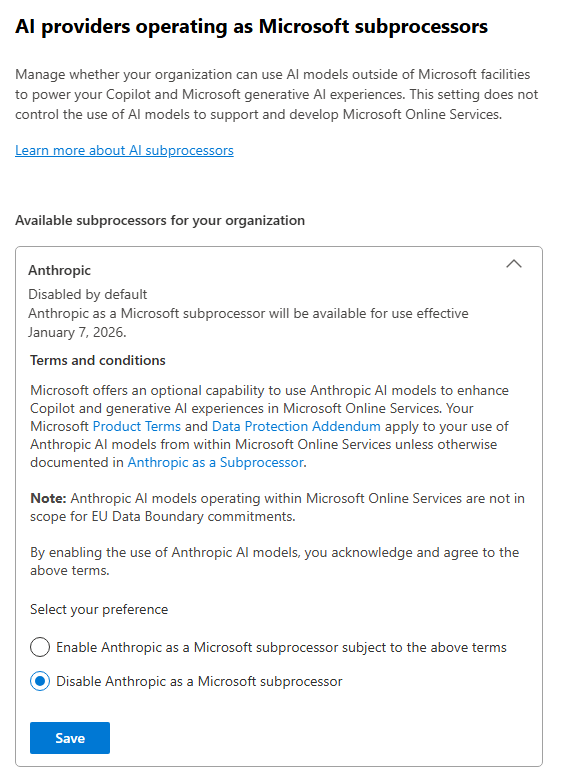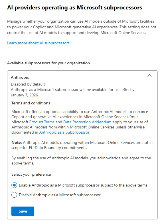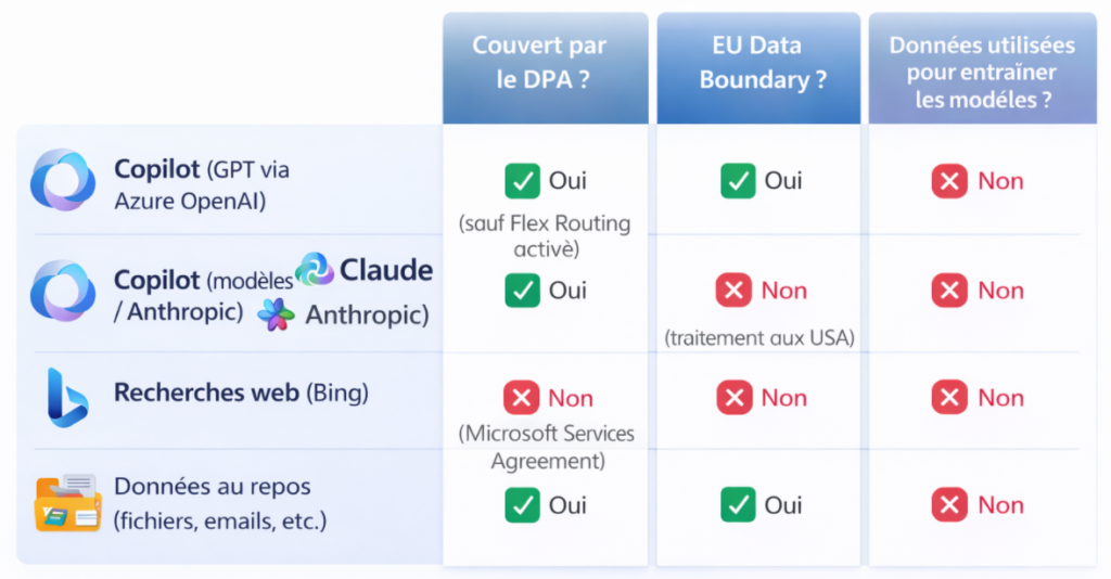 - Les modèles Anthropic (Claude) sont exclus de l’EU Data Boundary : le traitement se fait aux USA, sous le DPA de Microsoft avec Anthropic comme sous-traitant.