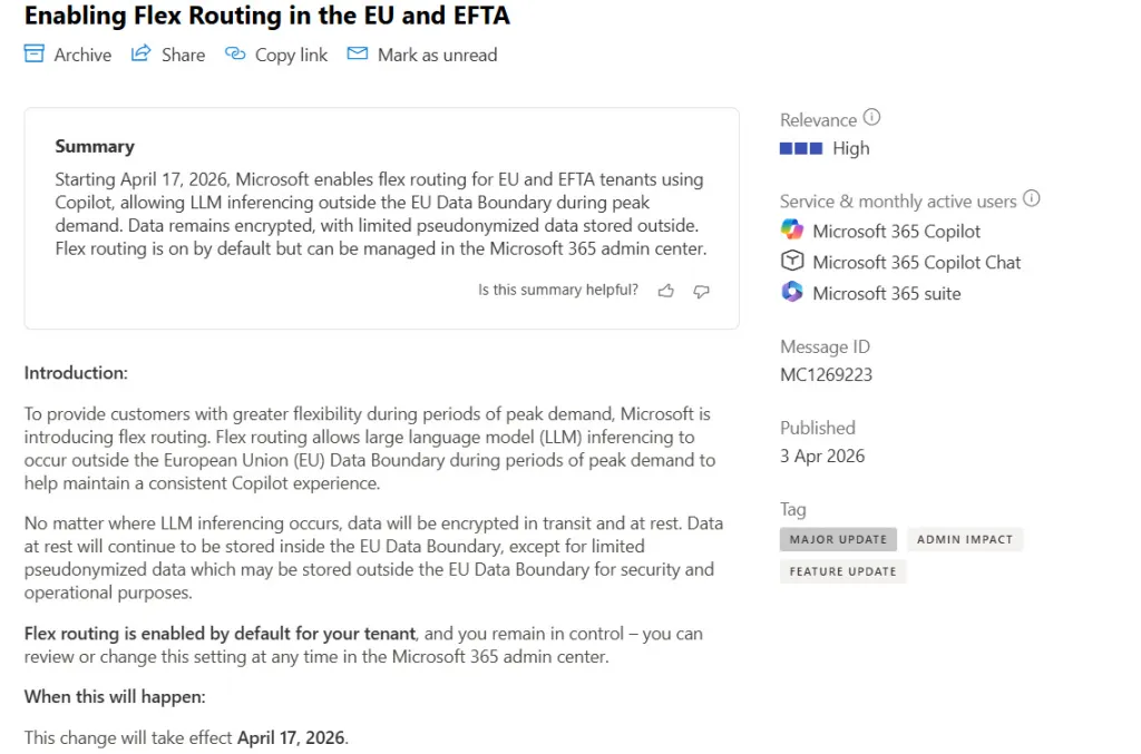 Microsoft a annoncé via le Message Center (notification MC1269223) l’introduction d’une nouvelle fonctionnalité appelée Flex Routing (routage flexible). À compter du 17 avril 2026, cette fonctionnalité est activée par défaut pour tous les tenants situés dans l’UE et l’AELE.