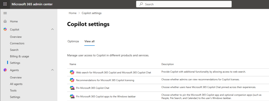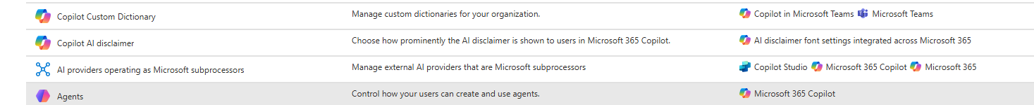 NB : Ce paramètre couvre Microsoft 365 Copilot et Copilot Chat. Il existe un paramètre séparé dans le Power Platform Admin Center pour Copilot dans Dynamics 365, Power Platform et Copilot Studio, mais celui-ci respecte le paramètre du M365 Admin Center sauf s’il est configuré de manière plus restrictive.