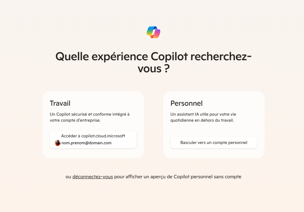 Arrivée sur le portail Microsoft Copilot, l’utilisateur peut démarrer l’utilisation du chatbot en version grand public (Copilot Chat Web) ou en s’identifiant avec ses informations de l’entreprise pour basculer en mode professionnel (Copilot Chat Work)