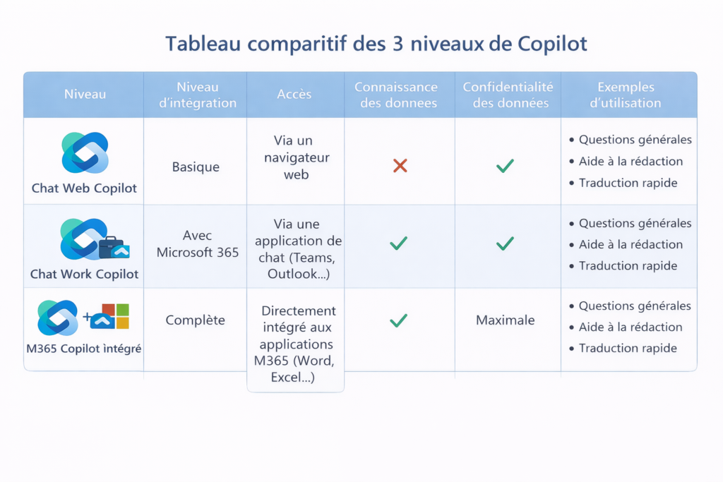 - Il existe plusieurs niveaux de Copilot : Copilot Chat gratuit (web uniquement), Copilot Chat avec licence (accès aux données M365), et Copilot intégré dans les applications (Word, Excel, etc.).