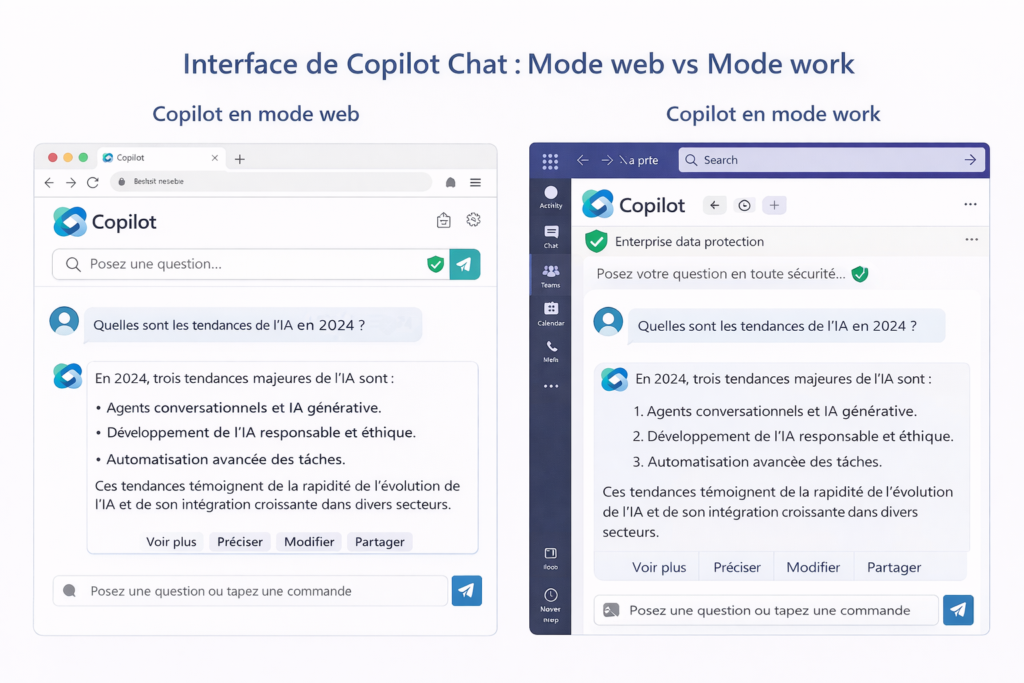 C’est cette combinaison LLM + Microsoft Graph qui rend Copilot réellement utile en entreprise, contrairement à un ChatGPT classique qui n’a aucune connaissance de votre contexte professionnel.