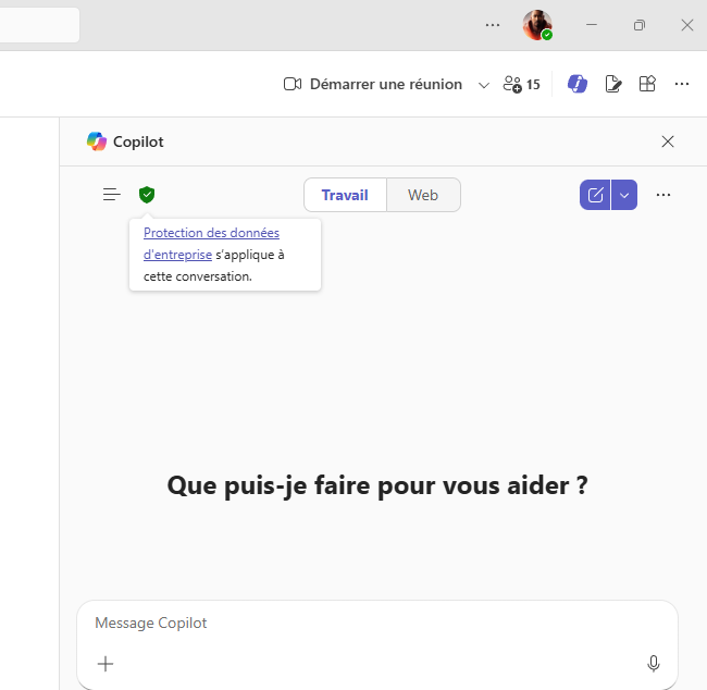 NB : Dans l’interface Copilot Chat, vous pouvez identifier le mode actif grâce à un bouclier vert qui apparaît en haut de la fenêtre. Ce bouclier indique que le mode « Enterprise Data Protection » est active et vous garanti la protection des données de l’entreprise.