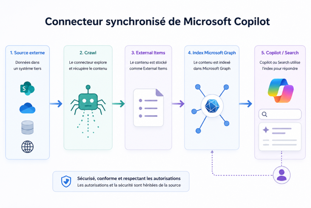 - L’indexation sémantique et les labels sémantiques sont les mécanismes qui rendent les données des connecteurs synchronisés exploitables par Copilot. La qualité du champ content est déterminante.