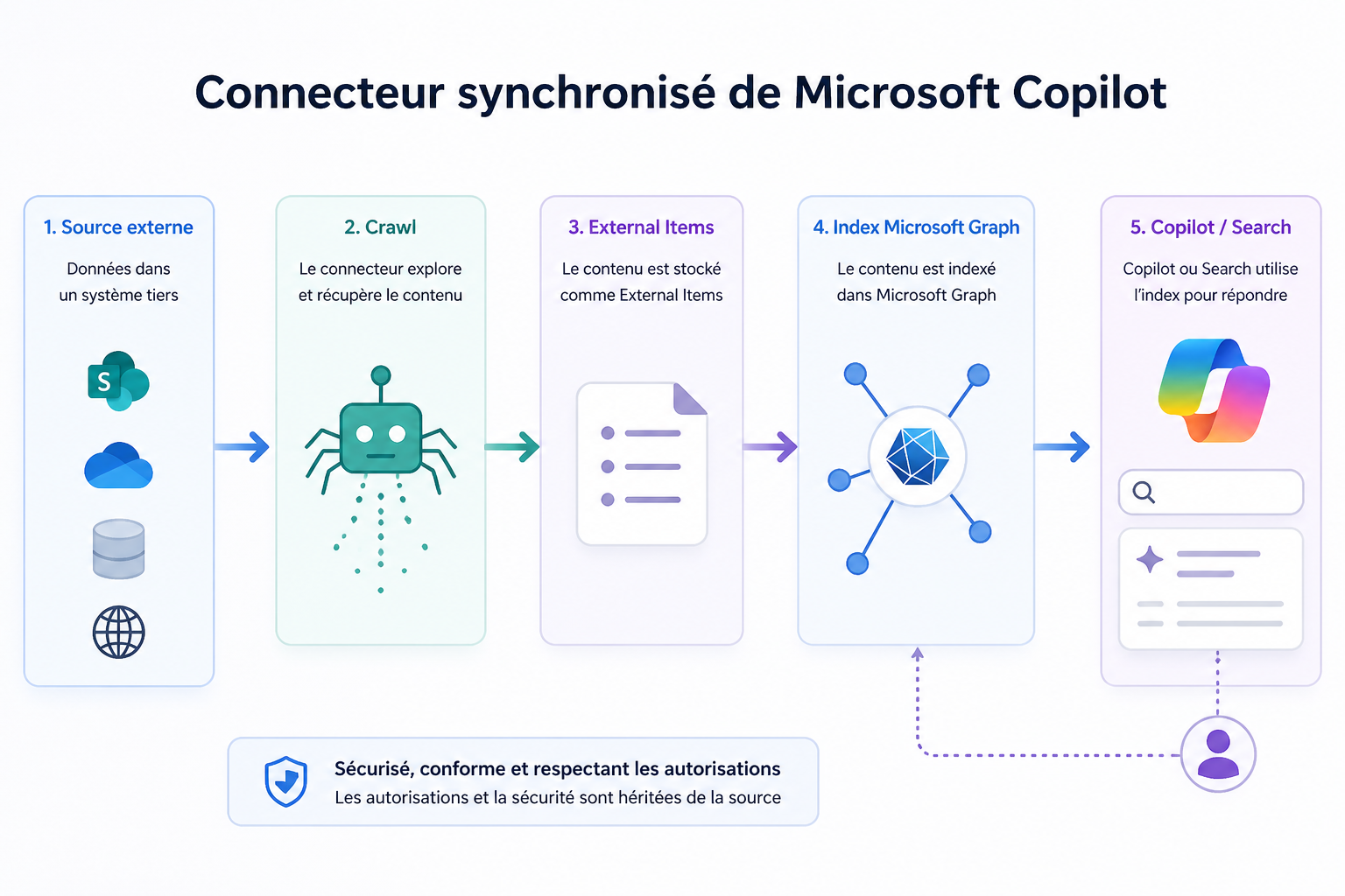 - Quand un utilisateur interroge Copilot, celui-ci peut retrouver et synthétiser le contenu indexé, en respectant les ACL.