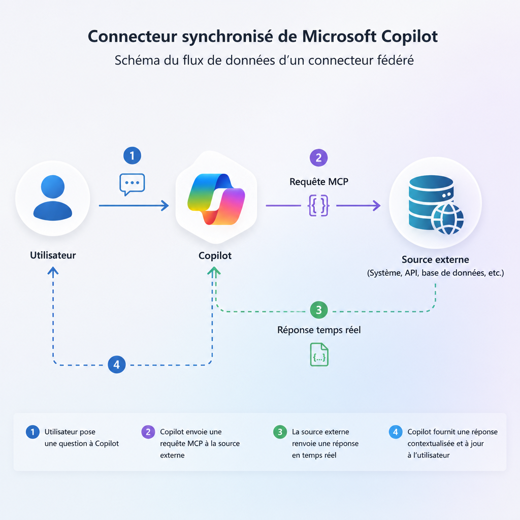 Principe de fonctionnement : Un connecteur fédéré ne copie aucune donnée dans Microsoft Graph. À la place, quand Copilot a besoin d’une information, il interroge la source externe en temps réel via le protocole MCP (Model Context Protocol). Les données restent dans leur système d’origine.