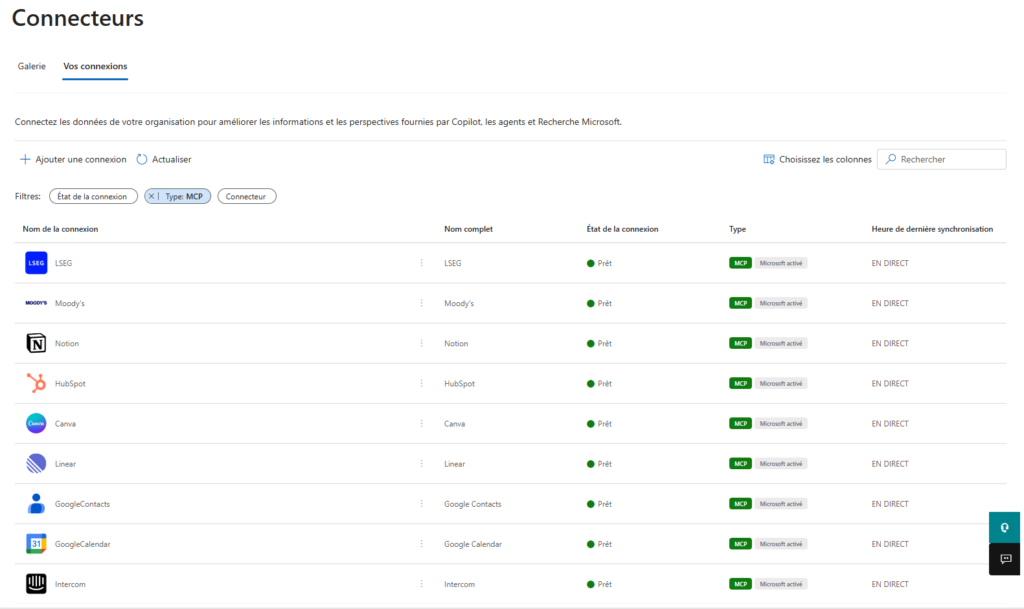 - Voir tous les connecteurs fédérés publiés par Microsoft dans l’onglet « Your Connections » (filtrer par type: MCP).