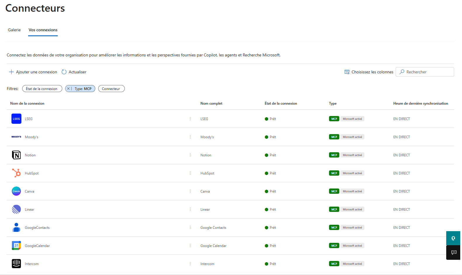 Depuis le 20 avril 2026, des connecteurs fédérés publiés par Microsoft apparaissent dans la galerie avec le type « MCP ». Les premiers connecteurs disponibles au GA incluent :