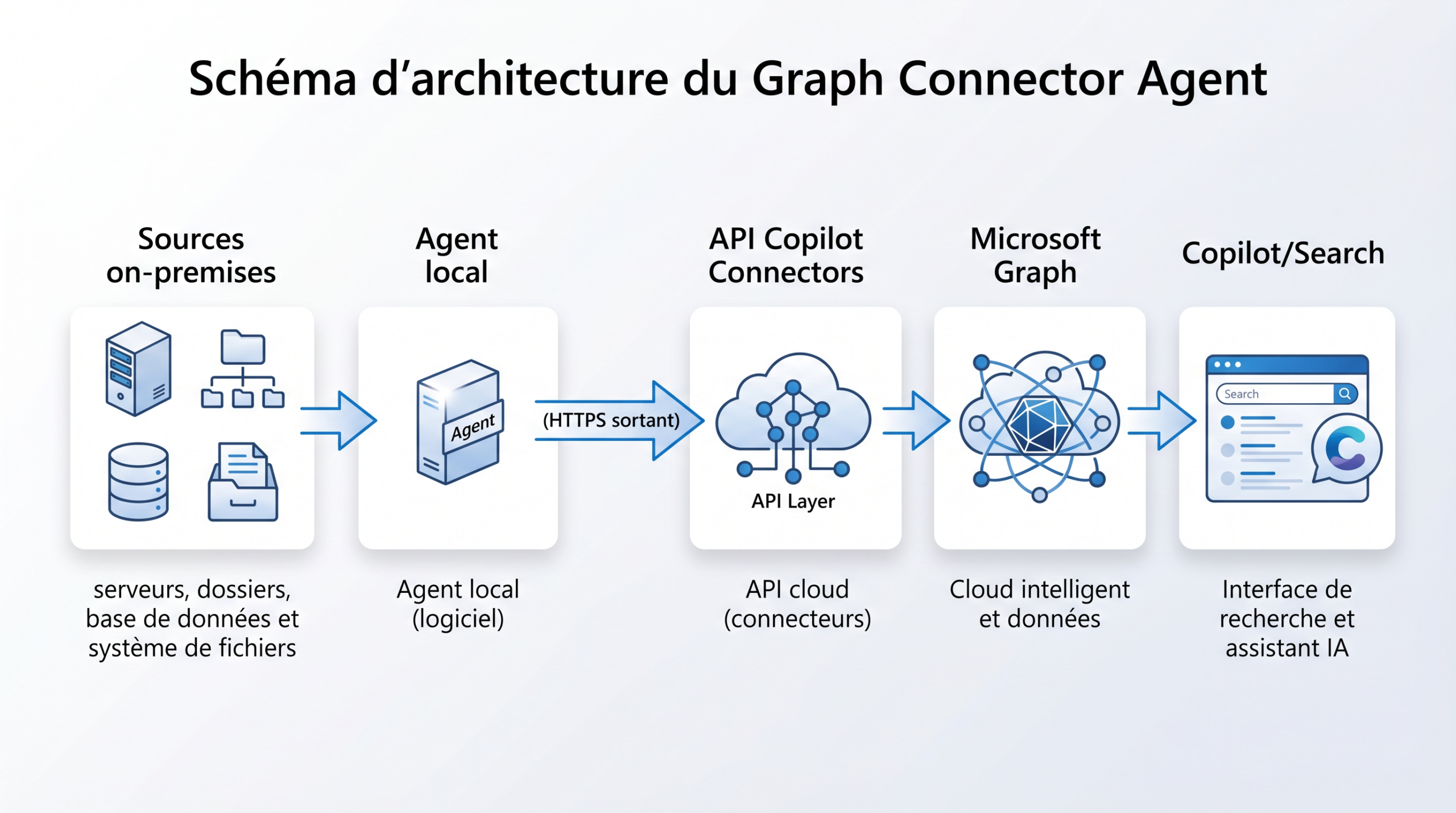 Pour ingérer ces données on-premises dans Microsoft Graph, Microsoft fournit le Microsoft Graph Connector Agent : un logiciel à installer sur un serveur de votre réseau local qui fait le pont entre vos sources internes et les API Copilot connectors dans le cloud.