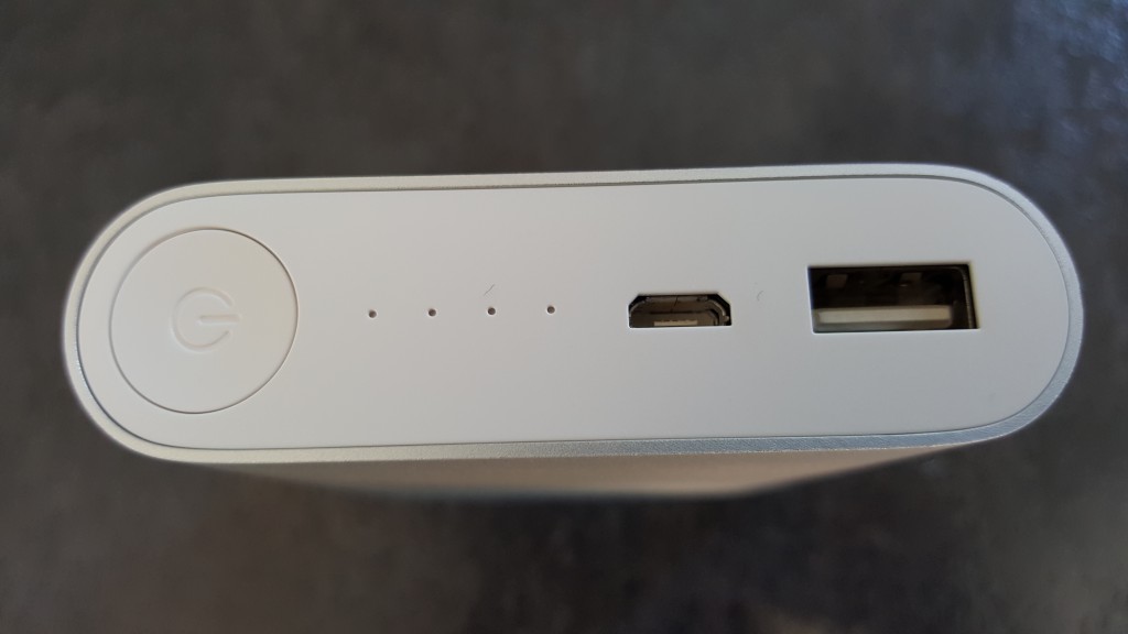 De gauche à droite, on retrouve un bouton physique qui permet d’afficher les témoins lumineux de charge de la batterie. Lorsqu’un périphérique est connecté à la Mi Power Bank, la charge démarre automatiquement. Un appuie court sur le bouton permet également de visualiser la charge restante à l’aide des 4 petites LED à droite du bouton. les LEDs clignotes lors d’une charge ou du chargement de la batterie. L’allumage fixe des LED indique également le pourcentage de batterie restant. Lorsque la batterie est complètement chargée, la recharge de la Mi Power Bank s’arrête :