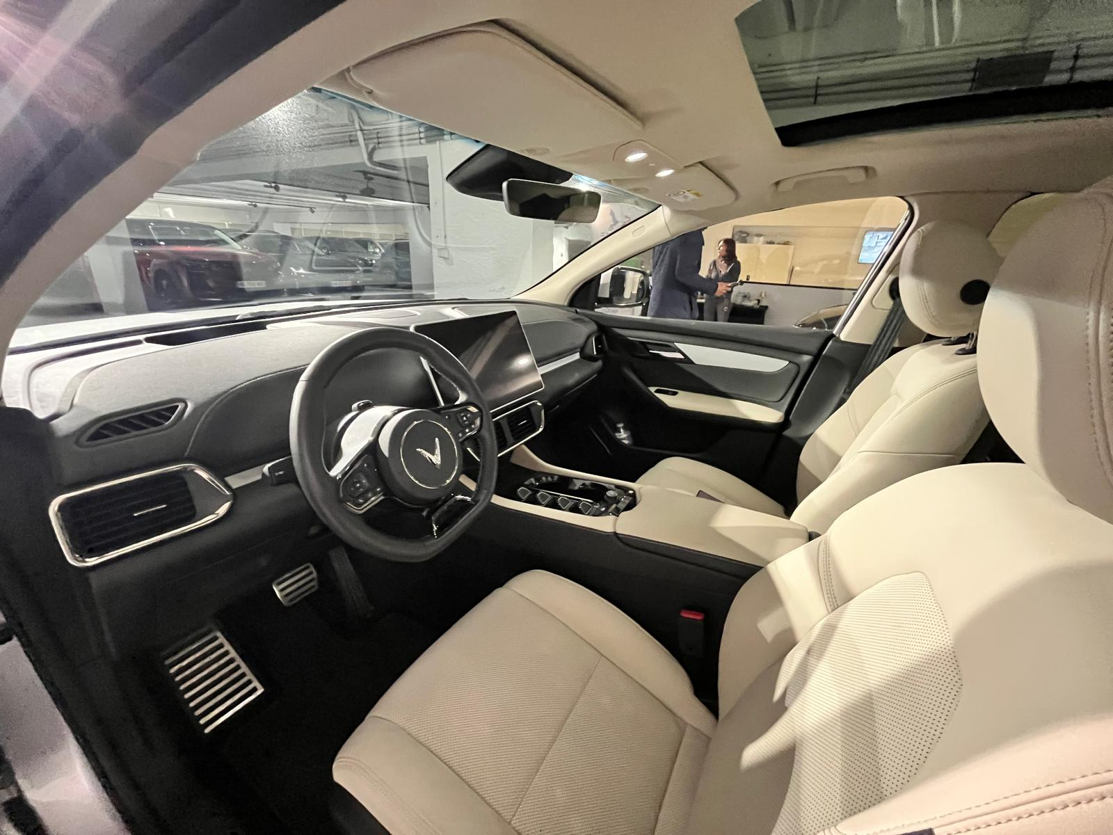 Je ne vais pas revenir en détail sur le VF8 Plus car j’y ai déjà consacré un long article sur ce blog. Mais pour les participants de cette journée qui ne le connaissaient pas, le VF8 reste le SUV premium de VinFast en Europe : design signé Pininfarina, double moteur électrique, transmission intégrale, 408 chevaux et 620 Nm de couple pour la version Plus, batterie de 87,7 kWh pour une autonomie WLTP de 457 km, un écran tactile de 15,6 pouces, 11 airbags, un pack ADAS complet de niveau 2, et surtout une garantie de 10 ans ou 200 000 km avec batterie garantie 10 ans kilométrage illimité. Tout ça à partir de 46 490 € en version Eco et 51 490 € en version Plus.